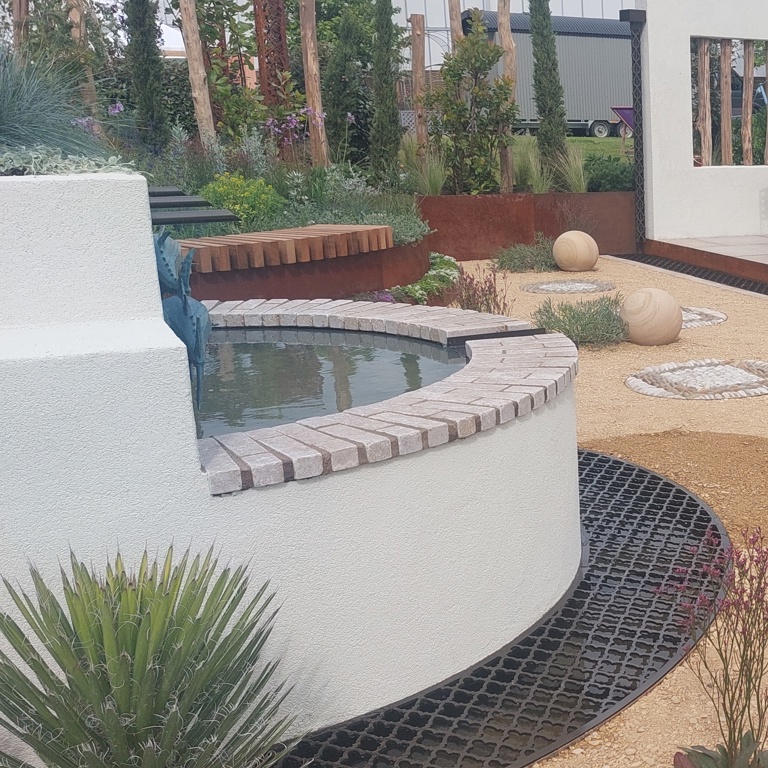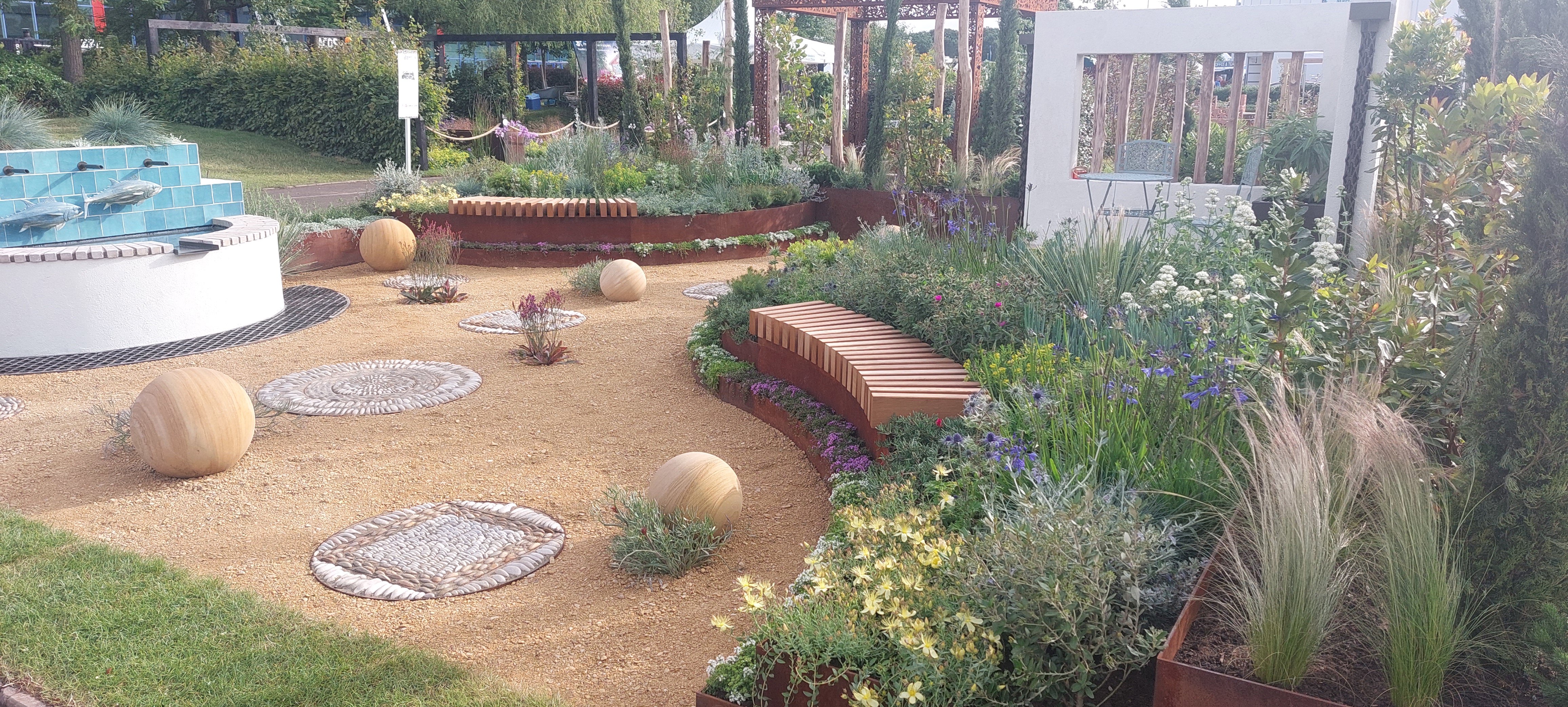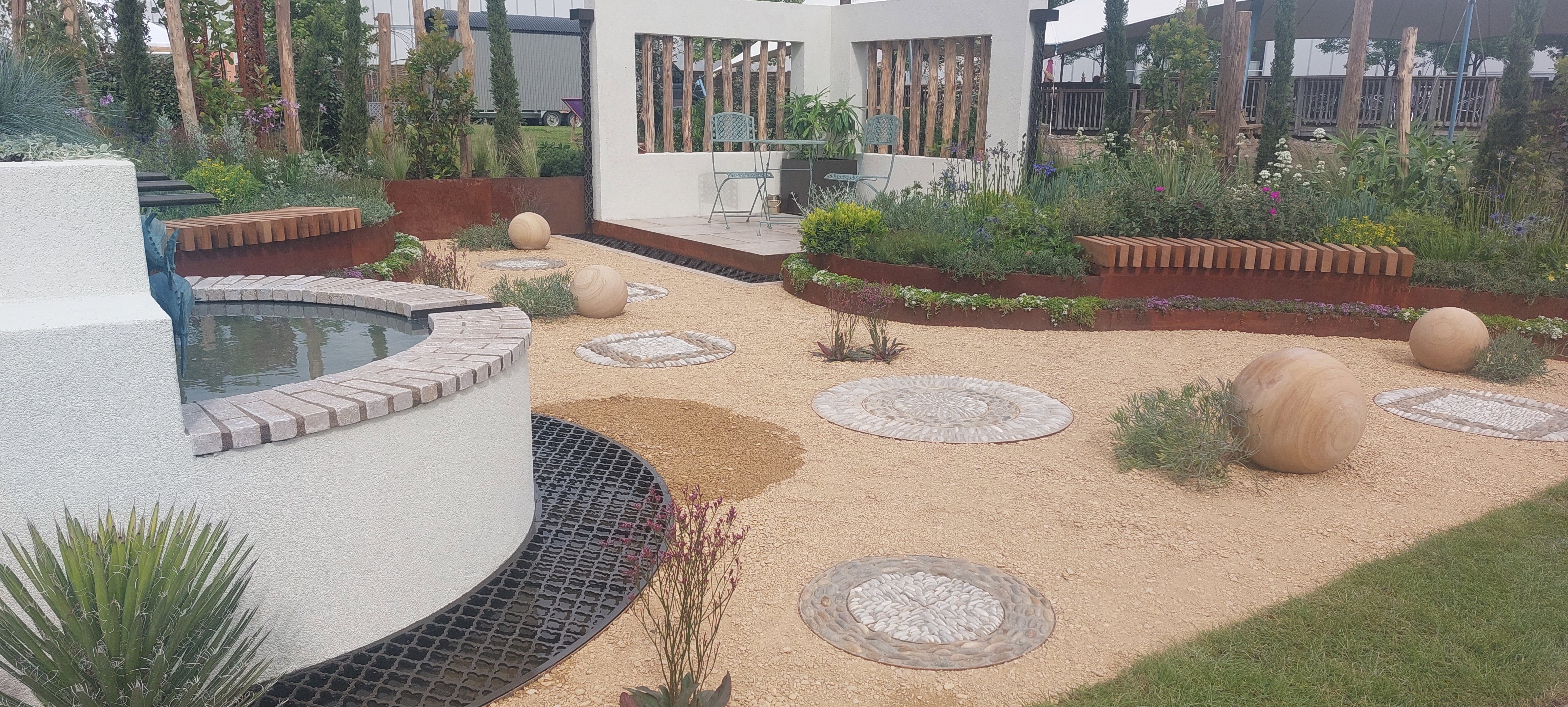 The ‘Costa Cadiz’ garden showcases, in a small and transferable scale, the landscape of the province of Cadiz on the southern Atlantic coast of Spain. It reminds many of the ‘Good Life’ that we live whilst away on holiday in warmer climates. Corten steel raised planters depict the red cliffs of this coastline, and sandstone balls represent the rocks and boulders that dot its length.