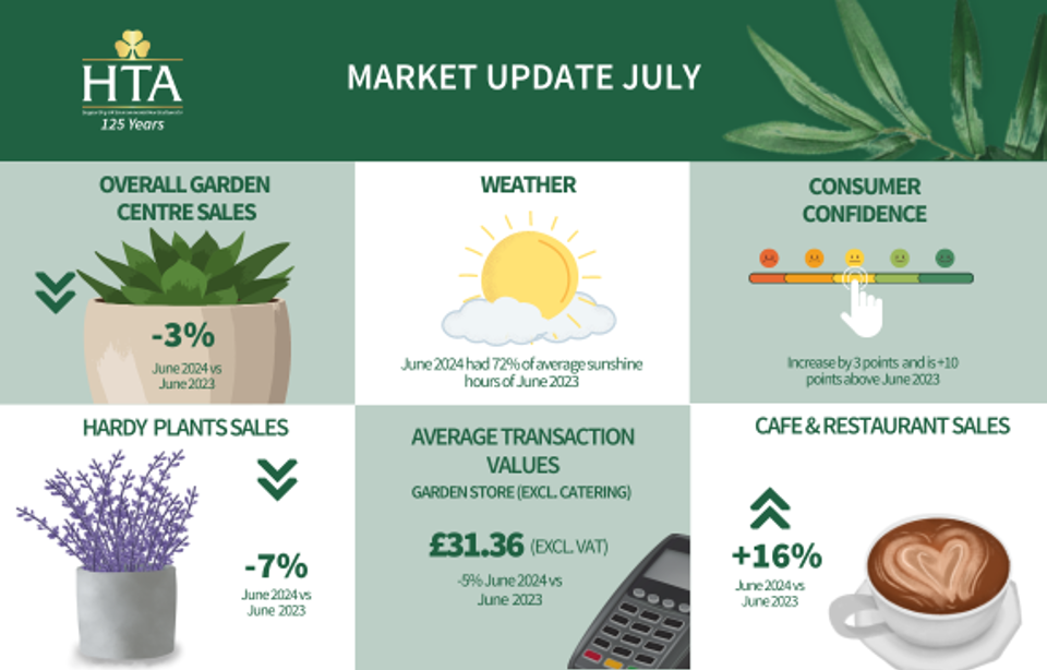In its July Market Update, the Horticultural Trades Association (HTA) reports that challenging trading conditions for garden centres continued in June 2024. Despite a general improvement in consumer confidence, ongoing adverse wet weather significantly affected sales in core gardening categories.