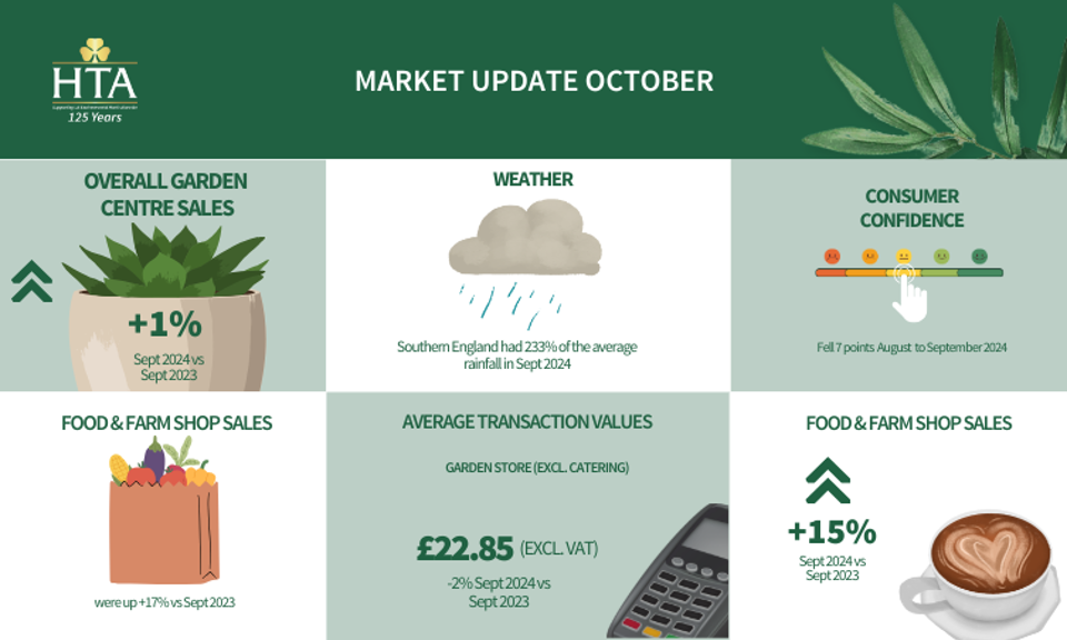 The latest Horticultural Trades Association (HTA) Market Update for October 2024 shows that overall garden centre sales in September 2024 increased by +1% compared to September 2023, driven largely by catering and non-garden categories. However, overall sales were down by -1% when excluding catering. In a dominant narrative for 2024, this is reflective of the challenges for garden-related sales in periods of adverse weather, seen across all areas of the UK.