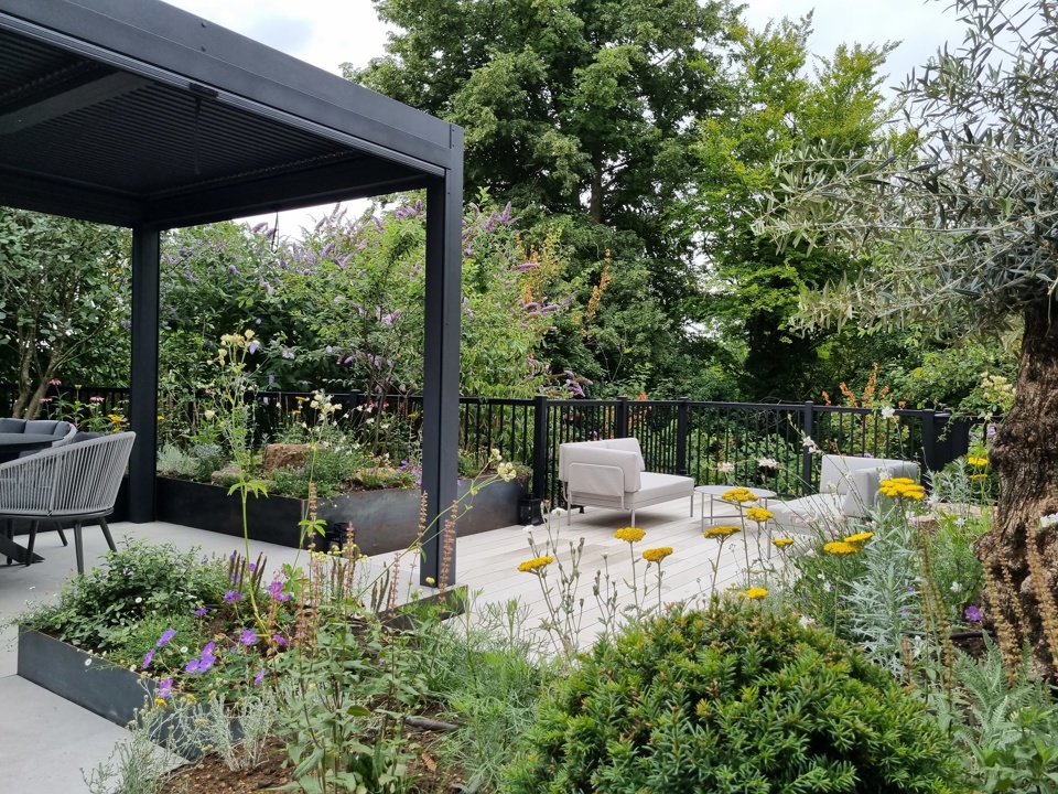 JJH Landscapes & Construction Ltd took home the top award for their project: The Escarpment Garden, designed by Adam Vetere. The client requested a contemporary courtyard design for the garden which was beautiful, fun, and welcoming. They wanted a nature friendly approach whilst providing space and areas in the garden for eating, entertaining, relaxing and reading. It had to be sustainable in terms of both the materials and plants chosen and positively add to the biodiversity and ecology of the rest of the site.